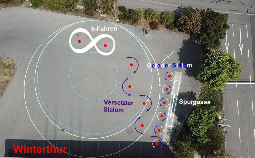 Mindestens zwei Fahrmanöver bei langsamer Geschwindigkeit, darin inbegriffen ein langsamer Slalom; dadurch soll ermöglicht werden, die Fähigkeit zur Bedienung der Kupplung im Zusammenhang mit der Bremse, das Halten des Gleichgewichtes, die Blickrichtung und die Sitzposition auf dem Motorrad zu überprüfen, wobei die Füsse auf den Pedalen verbleiben sollen.